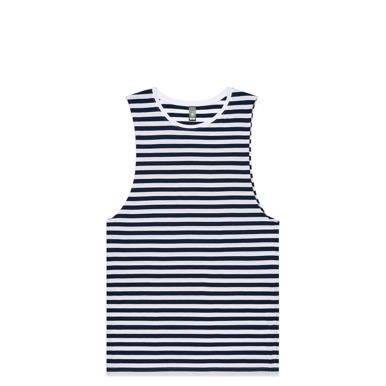 Sleeveless tank, raw armhole edges, varied stripe width across colours, neck ribbing, double needle bottom hem, preshrunk to minimise shrinkage