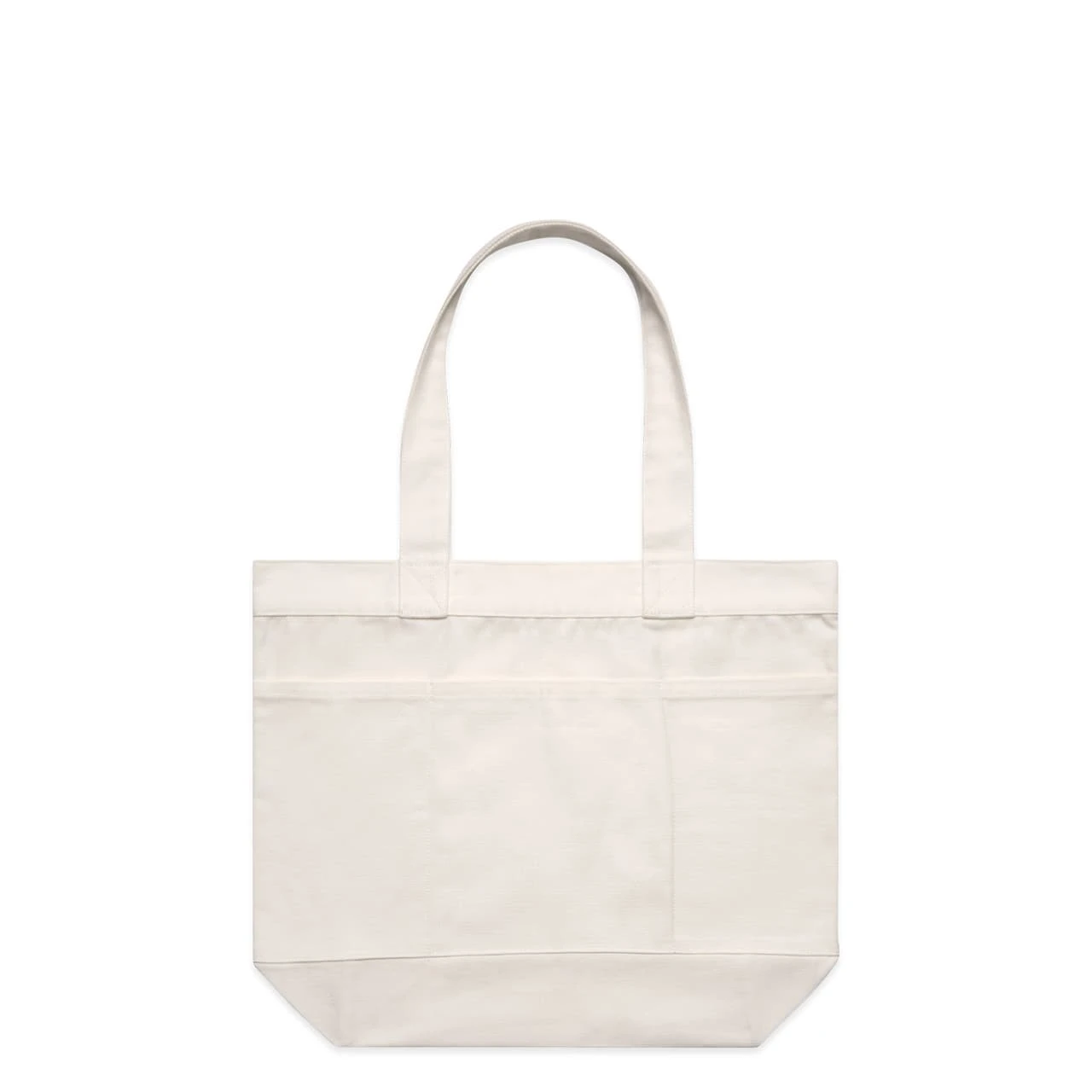 Introducing the Pocket Tote Bag, made from heavy-weight 320 GSM 100% cotton canvas. It features reinforced straps, a large main compartment, and three external pockets.