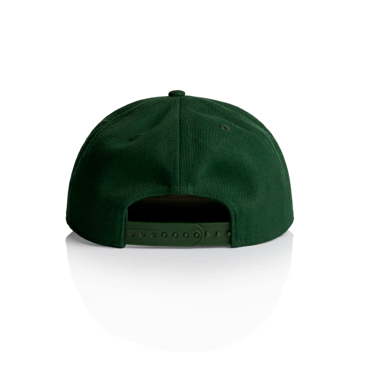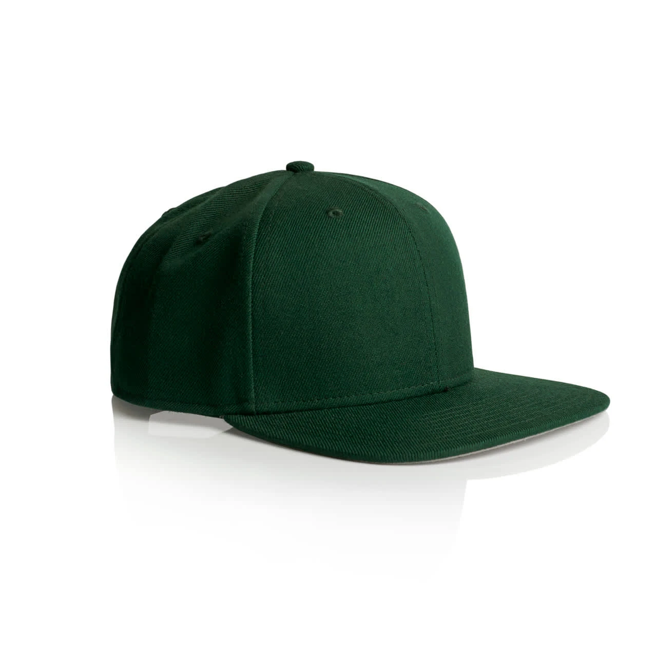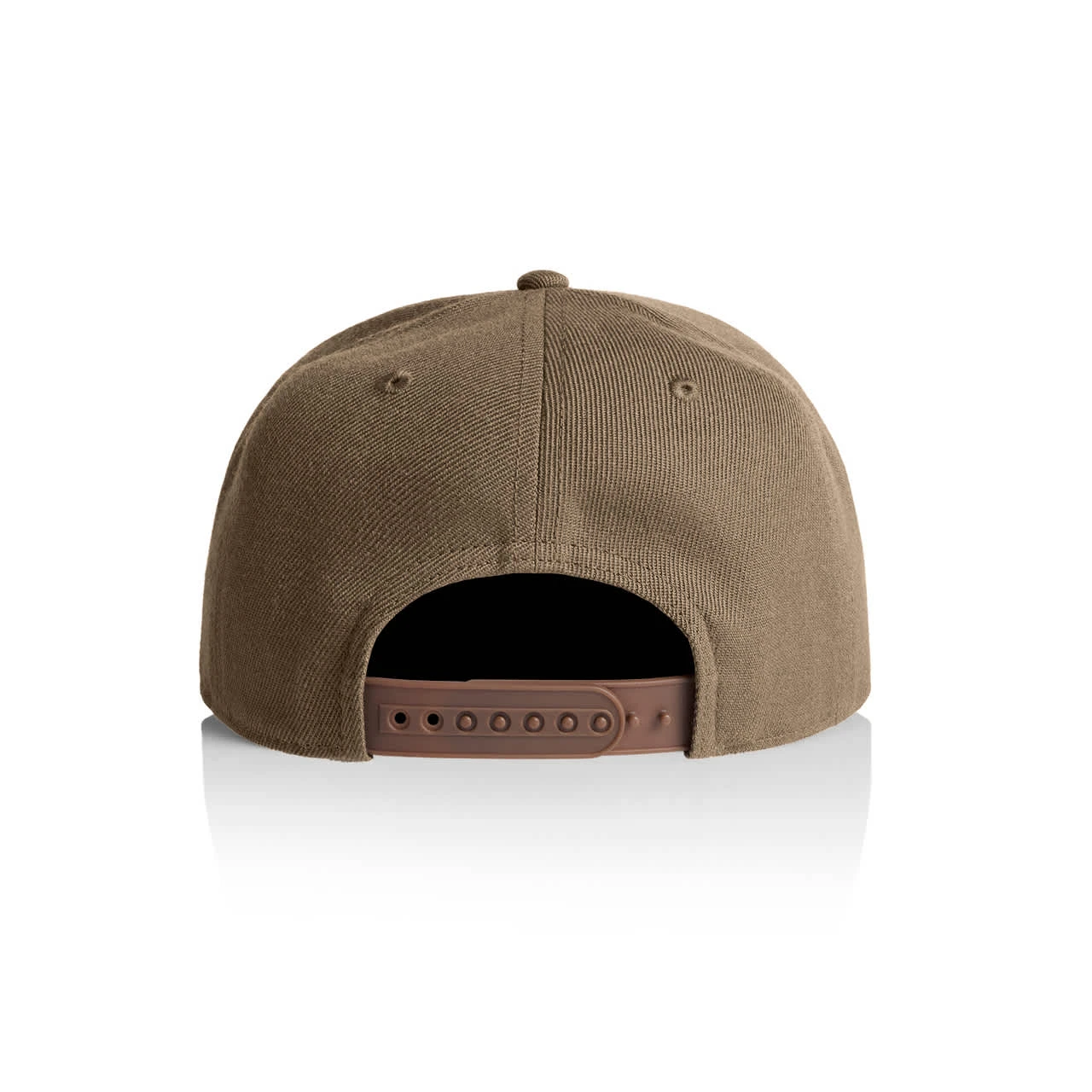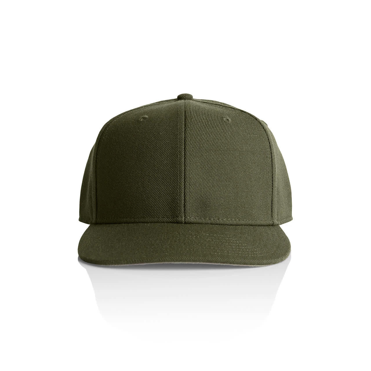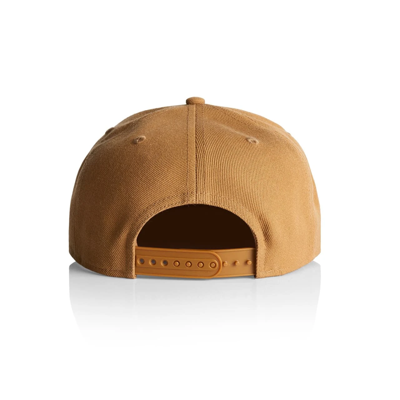 Explore the AS Colour Stock Cap: A high-profile snapback cap with a flat peak, crafted from mid-weight 80% acrylic and 20% wool blend. Features include a plastic snapback closure, light grey under-peak lining, stitching eyelets for ventilation, and a self