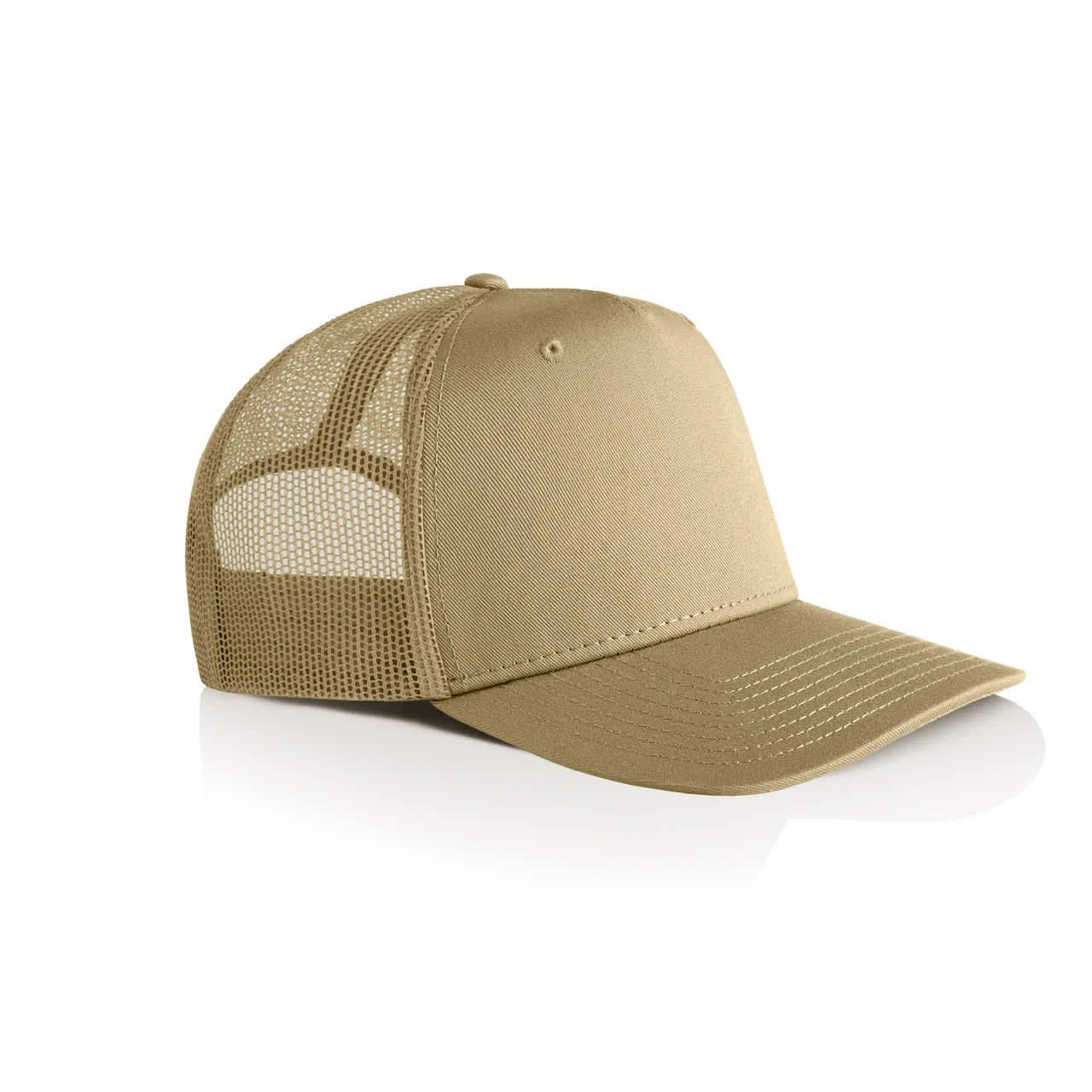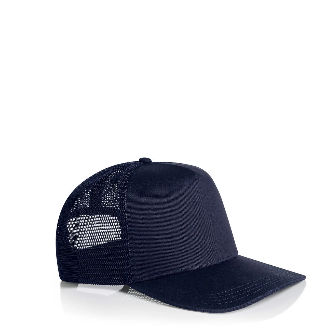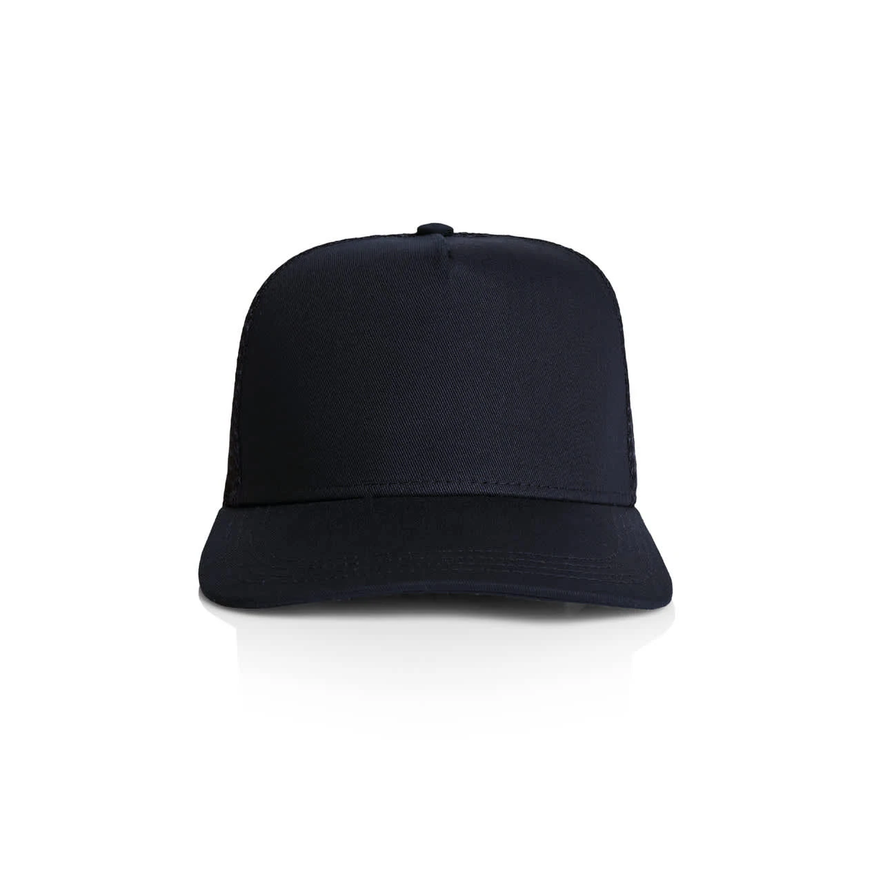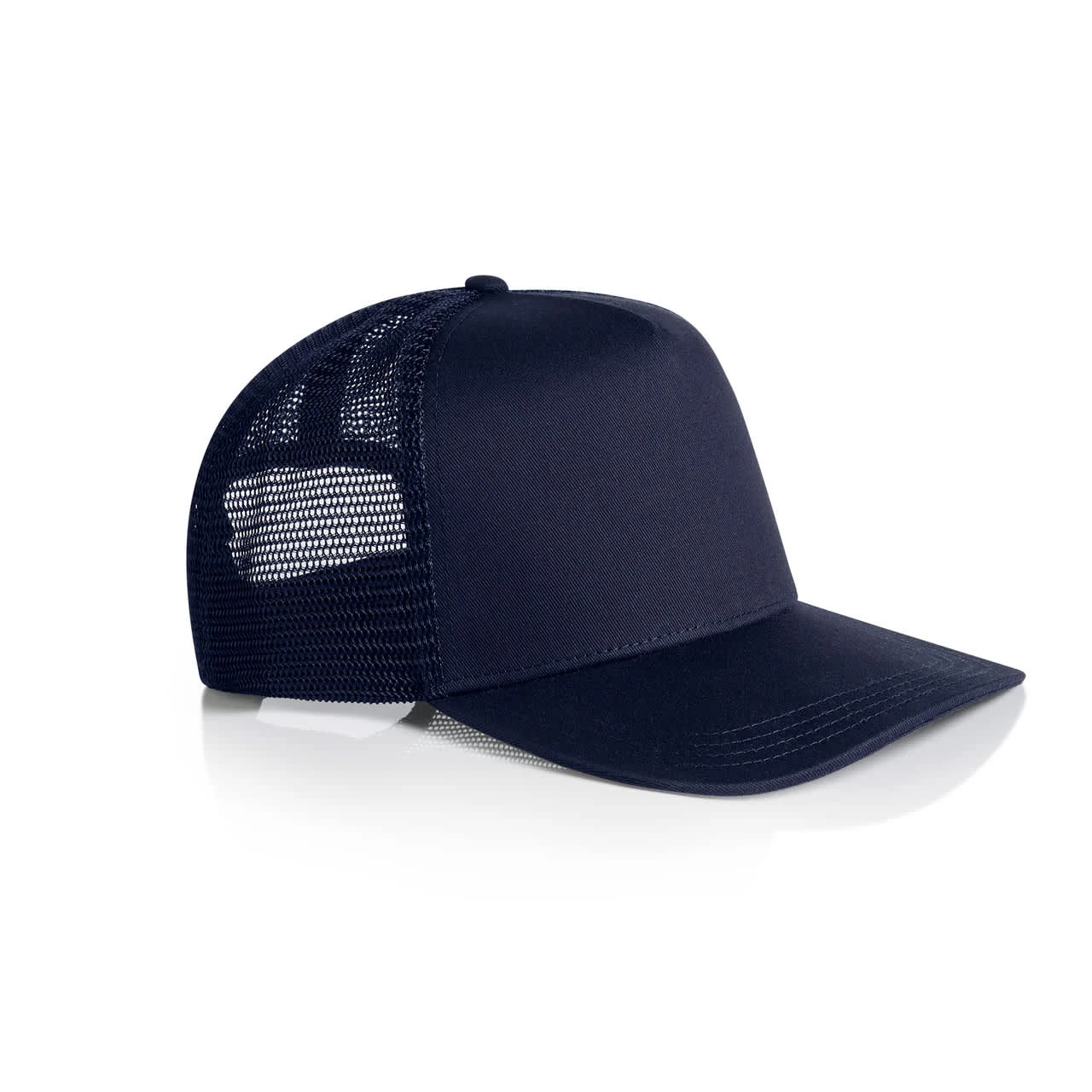 Explore the AS Colour Stock Trucker Cap: A high-profile snapback with a flat peak, featuring a mid-weight construction with a 100% cotton front and peak, paired with a breathable 100% polyester mesh back. Includes a plastic snapback closure, tonal under-p