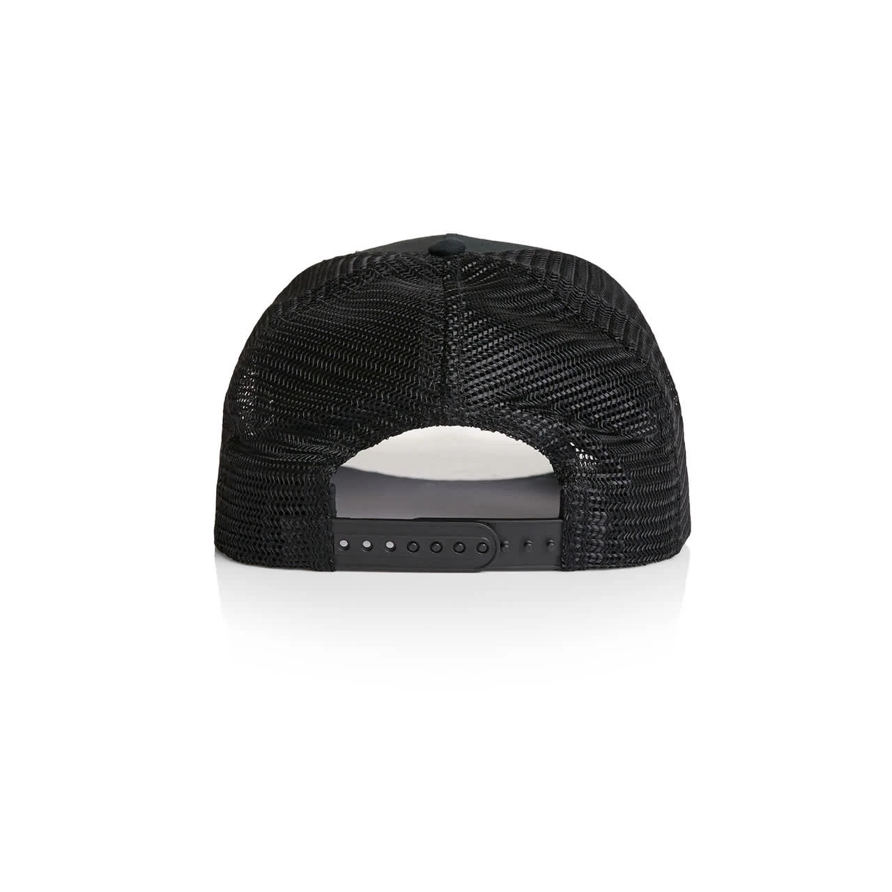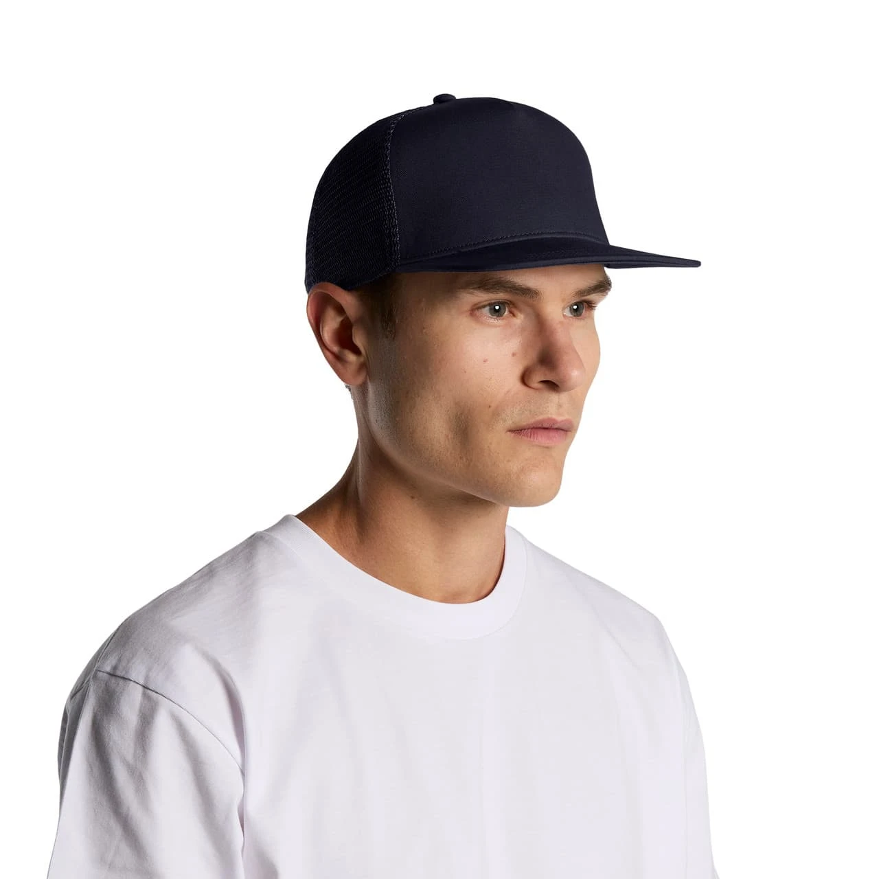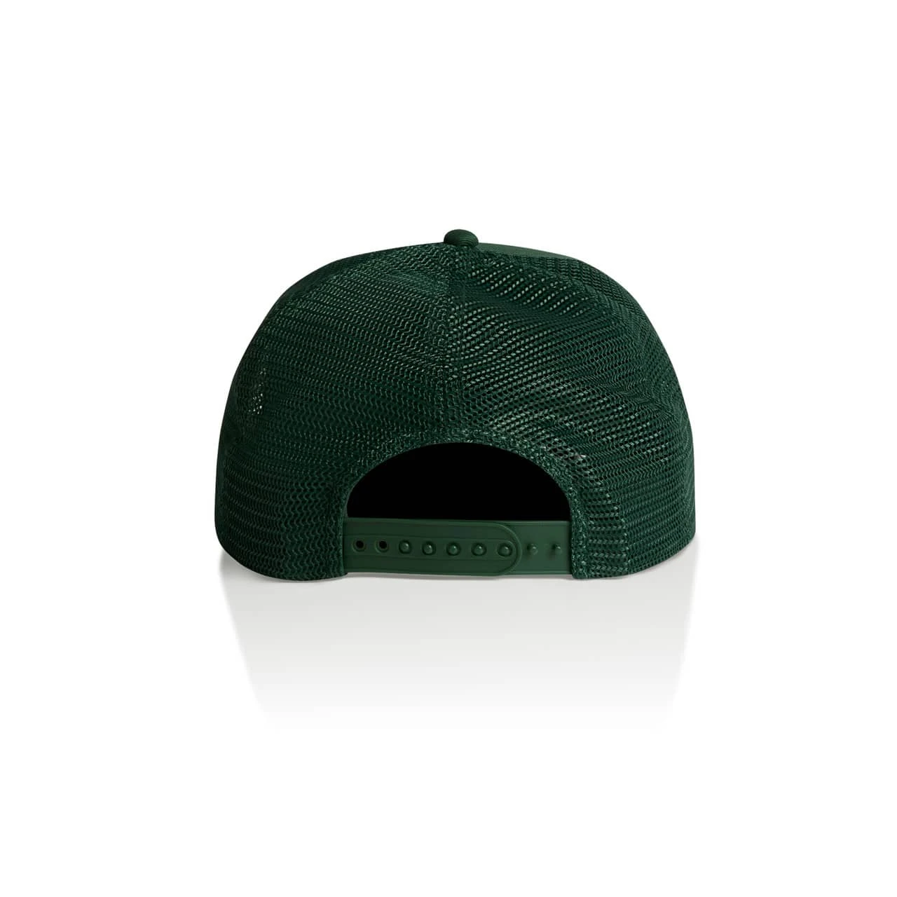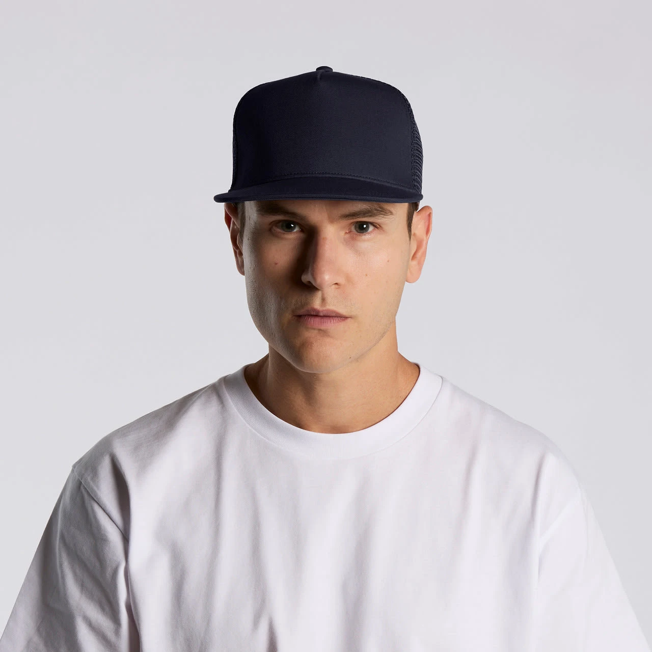 Explore the AS Colour Stock Trucker Cap: A high-profile snapback with a flat peak, featuring a mid-weight construction with a 100% cotton front and peak, paired with a breathable 100% polyester mesh back. Includes a plastic snapback closure, tonal under-p