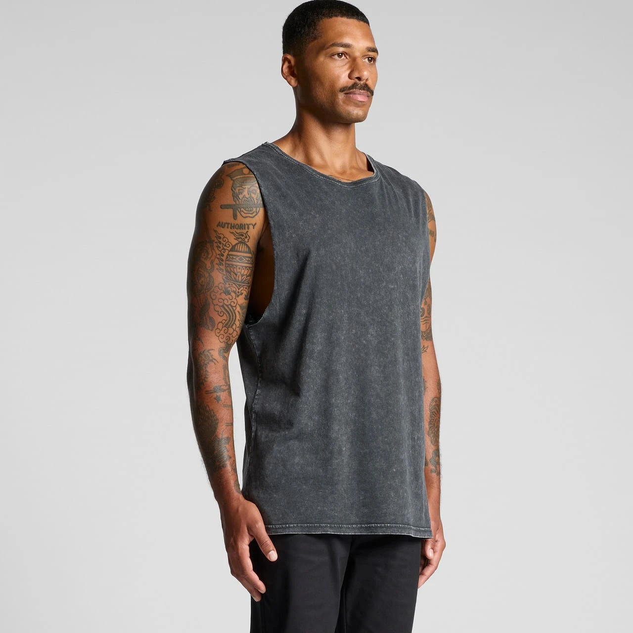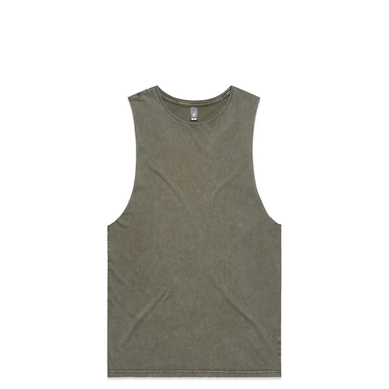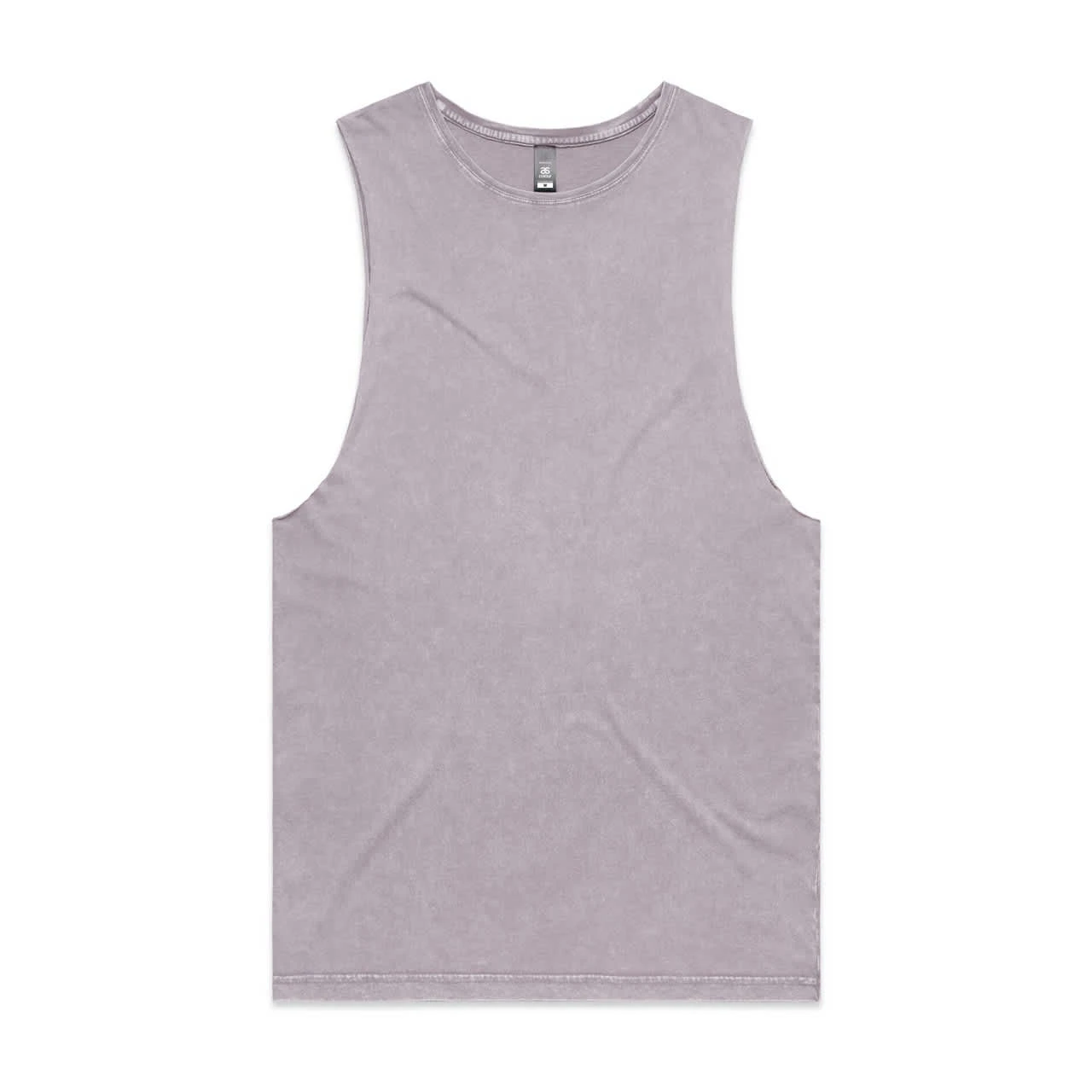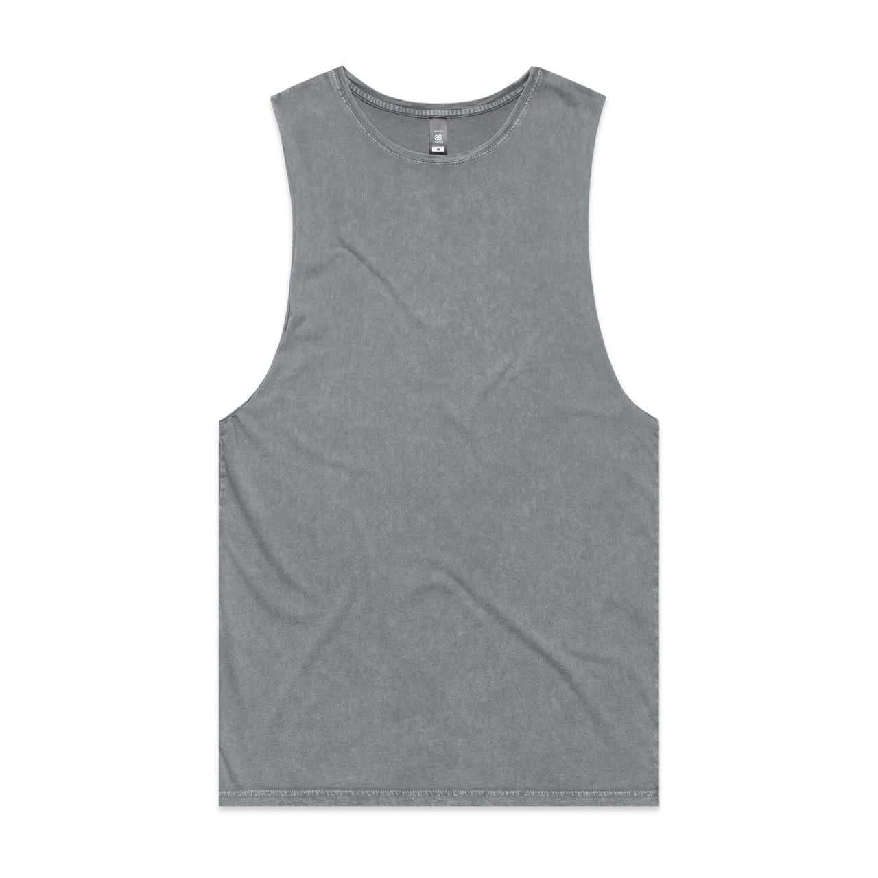 Sleeveless tank, raw armhole edges, stone wash finish with a worn look, ribbed crew neck, shoulder to shoulder tape, double needle bottom hem, preshrunk to minimise shrinkage